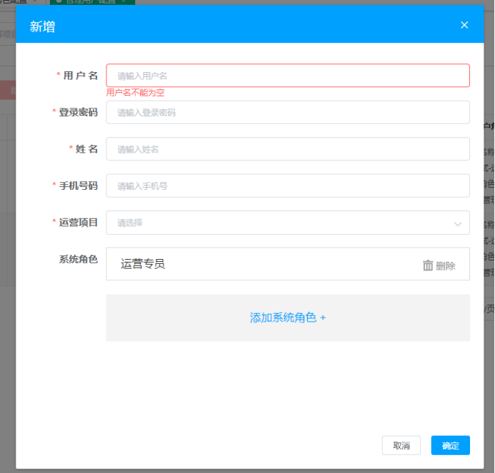 进入管理用户配置页面,点击新增按钮,录入操作员账号信息并勾选操作员角色。
