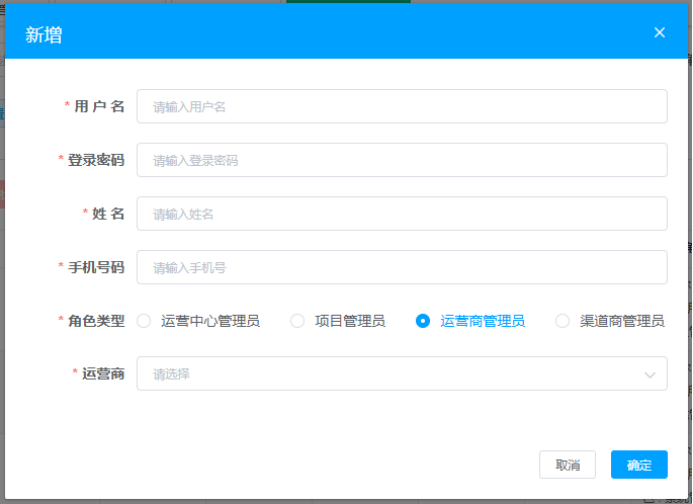 进入系统管理 - 管理用户配置页面,点击新增按钮,录入用户名、登录密码、姓名、手机号码、选择类型为运营商管理员或渠道商管理员、选择所属运营商或渠道商,点击确定按钮提交保存