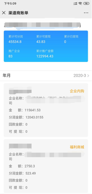 渠道商:参与业务推荐分佣, 可以从项目、企业、业务的订单流水中计算分佣金额,在微信端查看自己的分润金额