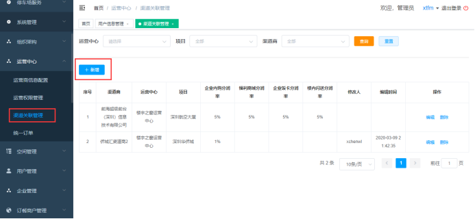 进入运营中心 - 渠道管理管理页面,点击新增按钮;