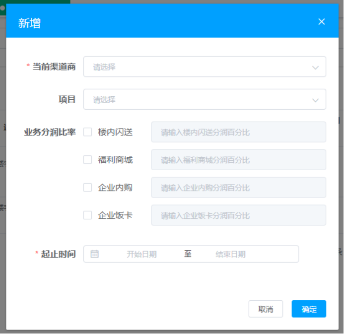 录入渠道商和要管理的项目,勾选要分润业务并设置分润比率,设置起止时间,点击确定按钮;