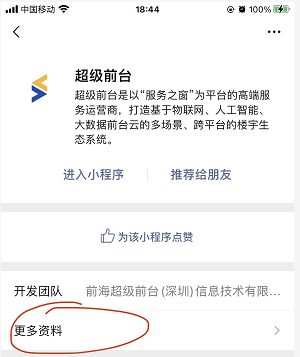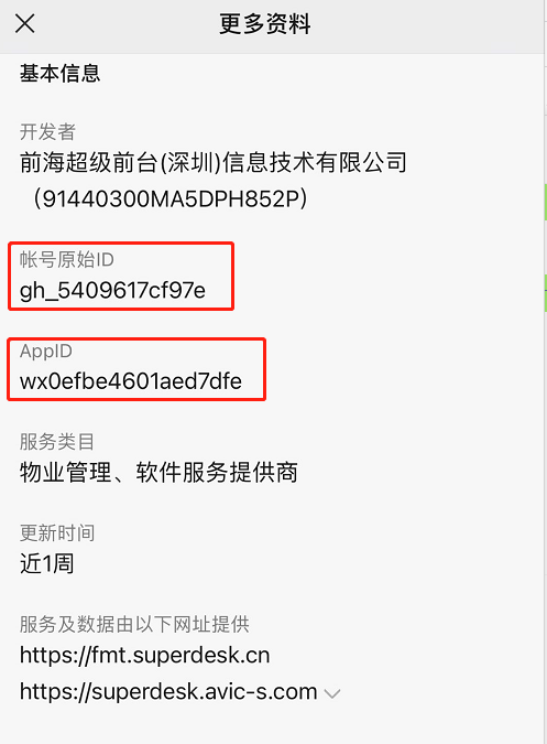 原始ID及appid,可以手机微信中查看 对应小程序的资料,超级前台 小程序相关信息。